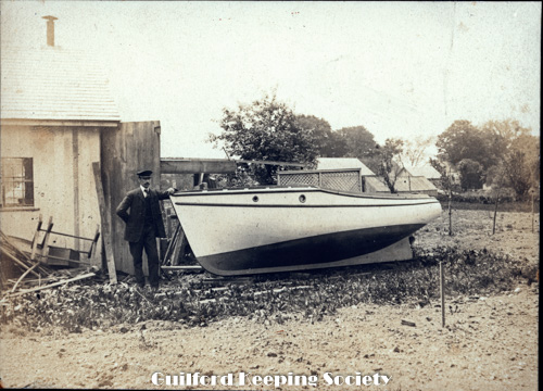 Capt. Louis Anderson builder 20 ft. launch. H.S. Davis owner Henry S, Davis and his boat on Pearl street, where the boat was built. HENRY S. DAVIS Negative HSD 60