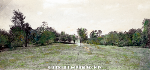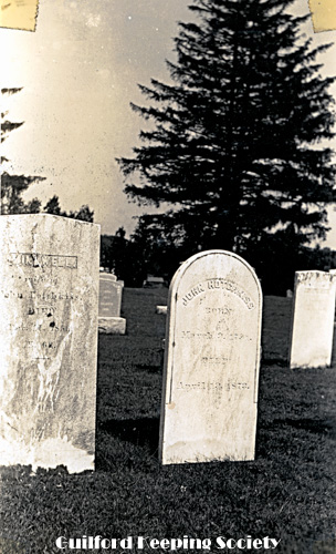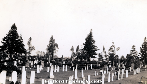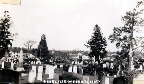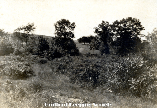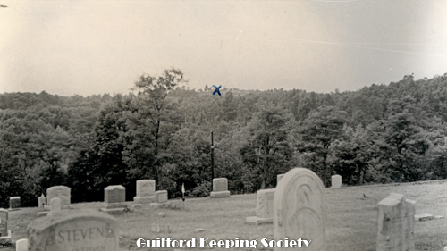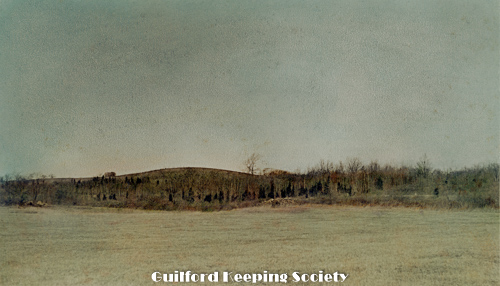 Looking across the lower end of the cemetery from the Church yard. The hill and spot marked with x is Sugar Loaf Hill and the spot where Caleb Fowler lived with his bride Moll C and later with Olive Meigs until leaving for Burton North Guilford Cemetery Ledge Hill Rd facing west. RUTH BENNETT.