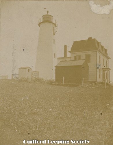 Lighthouse and dwelling on Faulkner’s Island. North side of the island. Earle Leete said that this barn on the right was replaced by a toolhouse. He and his father Edwin used to fish on the nearby island Gull Island and stay overnight here in bad weather. Circa1890-1900 Earle Leetes estimates 1910. Photo by? WEDMORE OR BRYAN