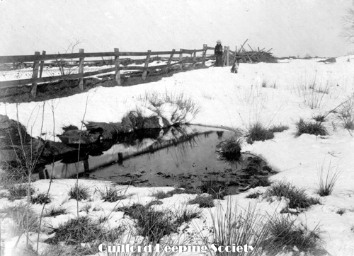 Spring in Beecher Lot, which has been excavated and enlarged to about 100 ft. in diameter to provide water for Fonicello truck gardens. The Beecher Spring is still visible from I-95 northbound, between exits 58 and 59. CHARLES D. HUBBARD scrapbook page 6.