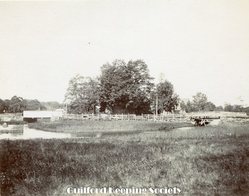 Jones Bridge north side showing water or tide gates Jones bridge over West River, north side, showing tide gates and a good view of the Putney House 1897 WILLIAM A. DUDLEY In Redfield Collection.