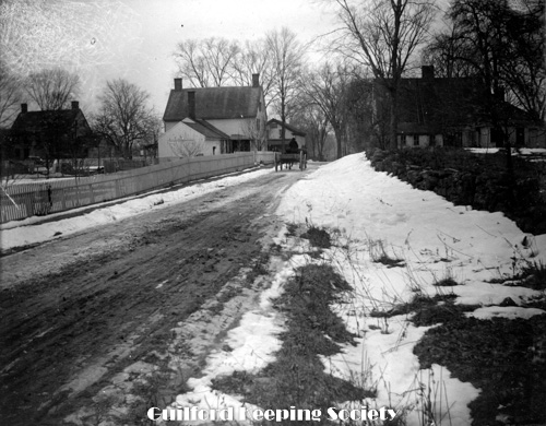 West Side Bridges. Henry Bishop’s house on the left, Nelson Norton’s on the right and Edward Norton’s in the background looking west. #55 York St is on the right, the Andrew Fowler house 1790.
