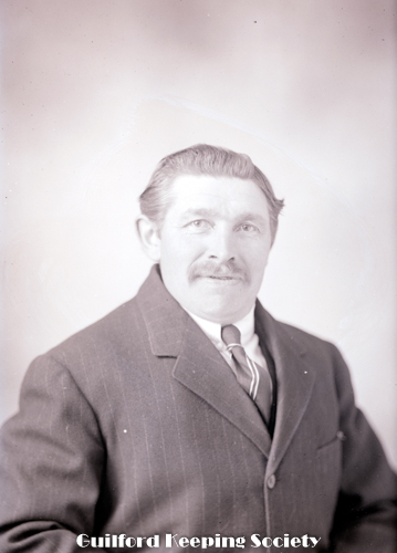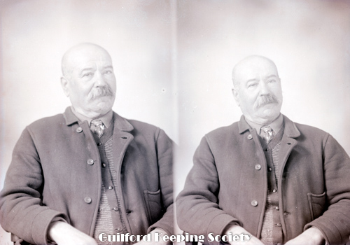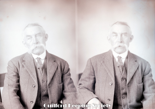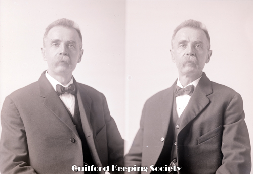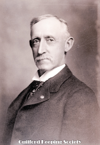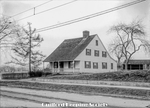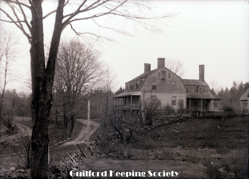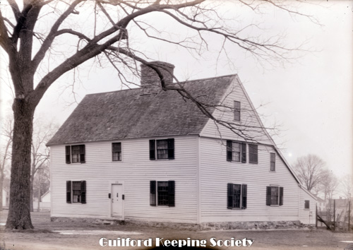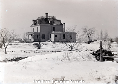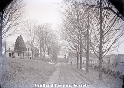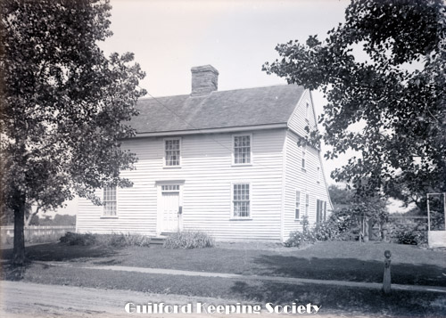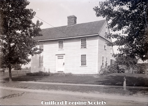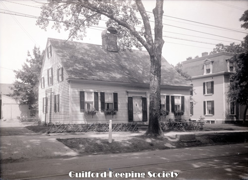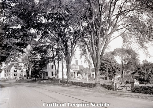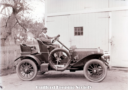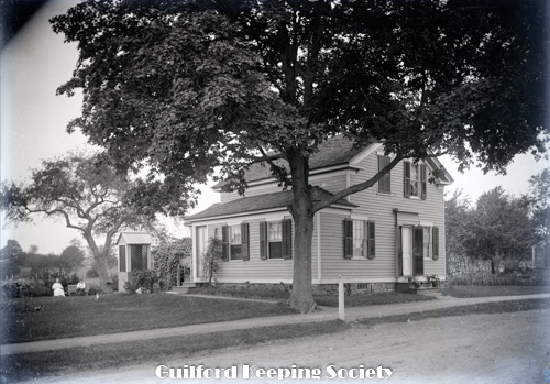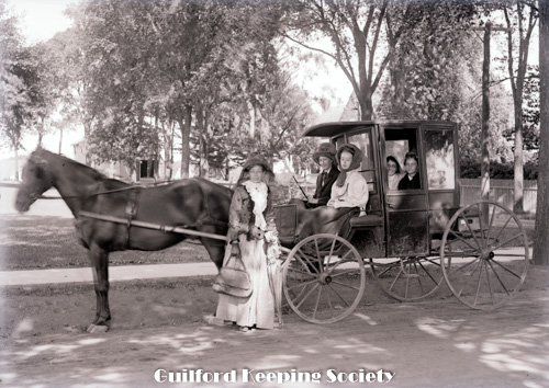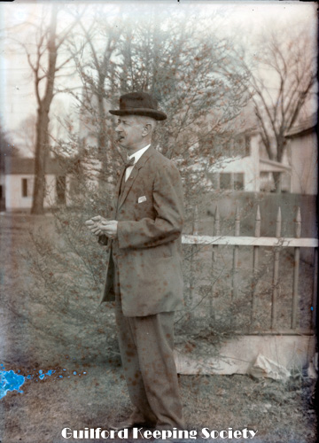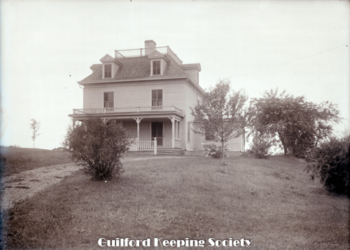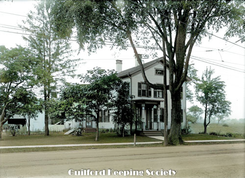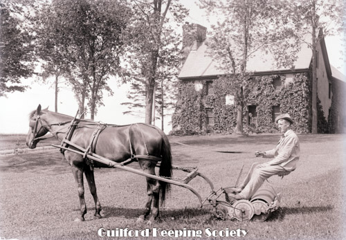 Henry Whitfield house with man on horse drawn lawnmower 248 Old Whitfield St c1905