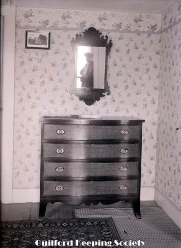 Eva B. Leete's antiques. Interior with ingrain carpet and 2 carpets over it. Chippendale mirror with woman's reflection, Federal style dresser with scalloped skirt and bracket feet 96 Fair St probably c1915
