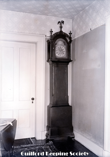 Eva B. Leete's antiques. Tall case clock with bracket feet, rope carvings on the edges, reticulated bonnet, center finial with Federal eagle. Lettering on the dial appears to say ___Chester 98 Fair St c1915