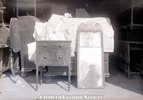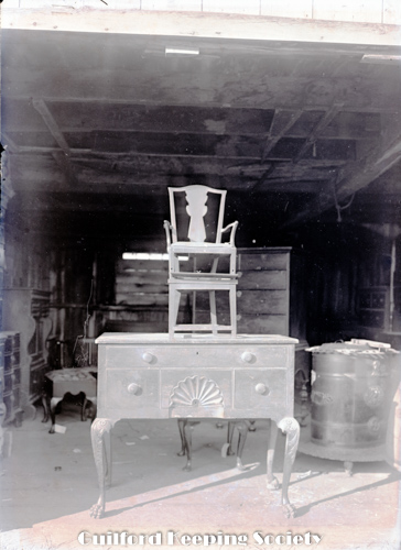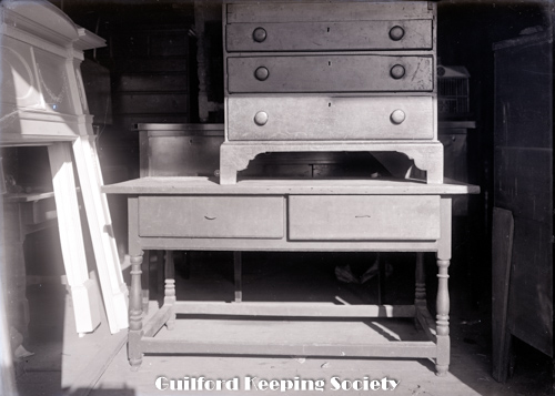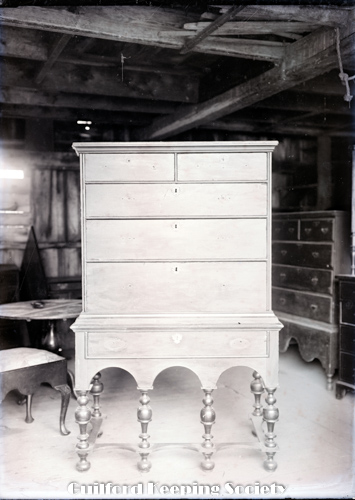 Eva B. Leete's antiques. Inside one of Edward Leete's workshops. William and Mary style chest on frame (highboy) with broken bracket at back, heavy turned legs 1090 Boston Post Rd or 148 North Fair St c1915