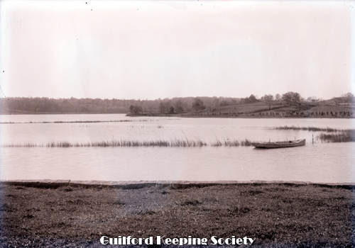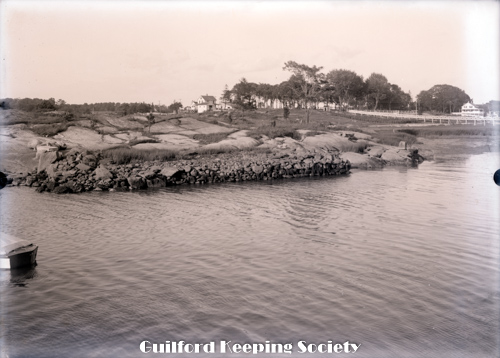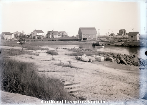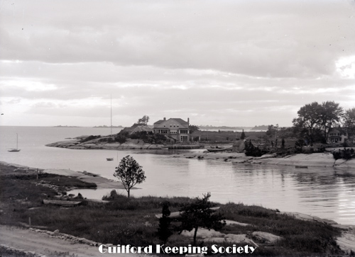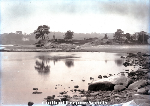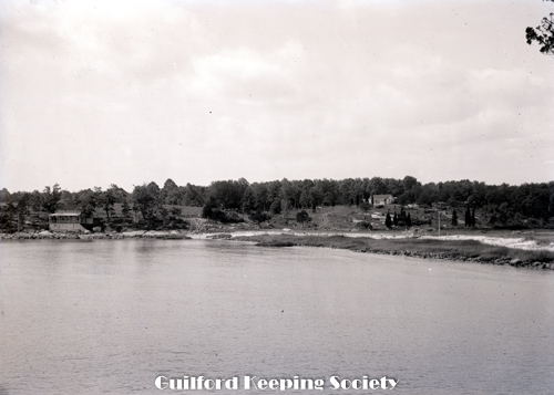 Shell Beach on Shell Beach Rd viewed from the southwest from the end of Joshua Point. House in the background is 616 Leete's Island Rd Shell Beach Rd c1915