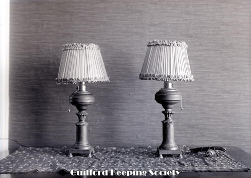 Eva B. Leete's antiques. Two electrified lamps with pleated shades 98 Fair St possibly inside c1915