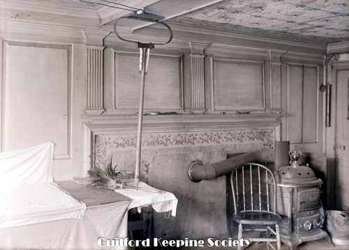 A front room with wood paneling, a turkey feather duster and a stove. Knob and tube wiring connected to an early antenna. Possibly 96 Fair St 96 Fair St interior c1915