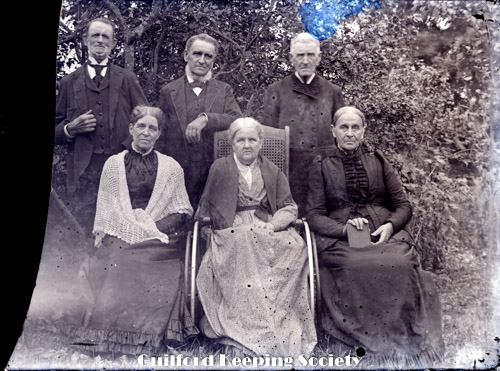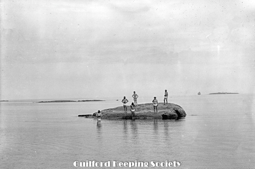 Sioux Indian guests visiting Howard Noble at his estate 80 Prospect Ave Sachems Head. Indians with towels on Jefferson Rock off Prospect Ave. Faulkner's Island in right background July 1916 Henry S. Davis