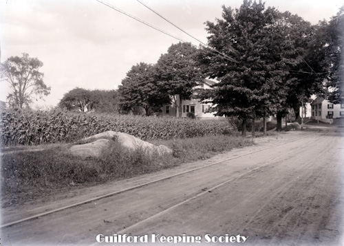 Boston street scene looking east. Cornfield west of Thomas Burgis house at 150 Boston St and rock are on the left, Thomas Griswold house is on the right Boston St c1915