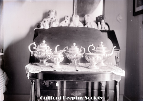 Eva B. Leete's antiques. A four piece tea set that may be silver, on a card table with reeded legs 96 Fair St c1915