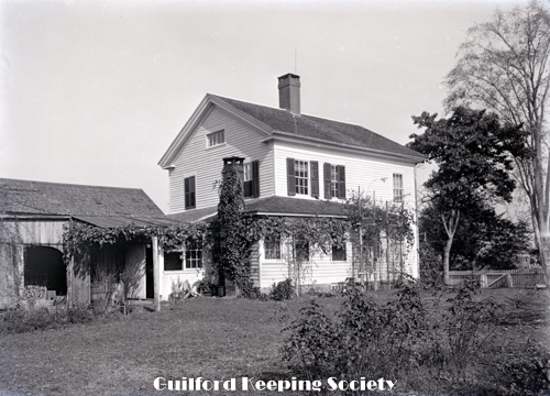 side view of a Greek Revival house with a one story addition. Sheds show behind the house c1915