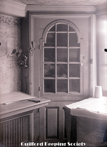 Eva B. Leete's antiques. A built in corner cupboard with arch top, 15 pane single door and 2 panel single bottom drawer 96 Fair St c1915