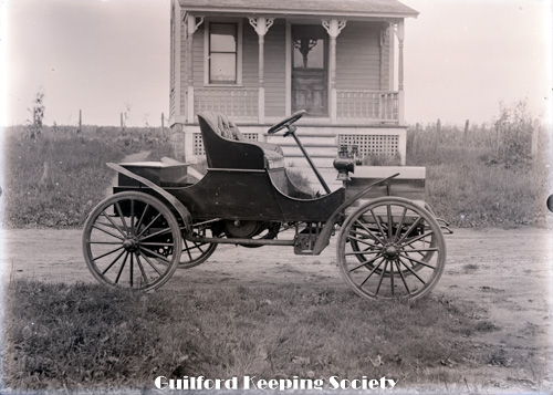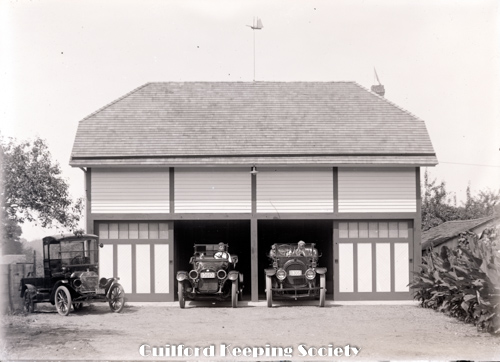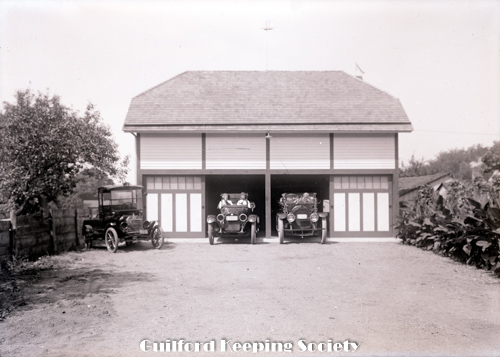Four bay garage behind Abraham Woodward house 96 Fair St with 3 cars identified by Shelton Dudley as 1910 Pope, 1915-17 Buick and 1914 Ford behind 96 Fair St c1918