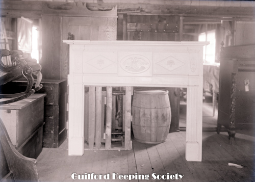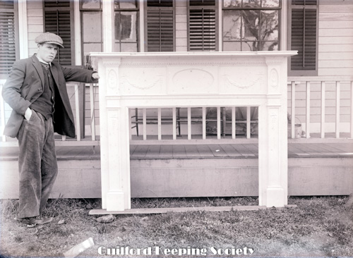 Eva B. Leete's antiques. Man, possibly Frank Leete, standing next to federal style mantel. Outside 98 Fair St 98 Fair St outside c1915