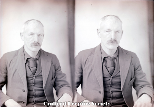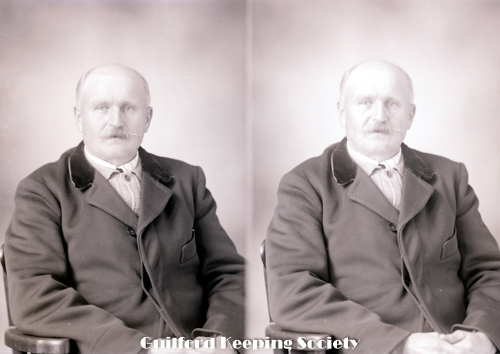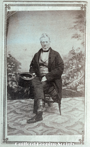 photo copy, of a man in a suit and top hat with a studio backdrop. Possibly a Civil War portrait c1915