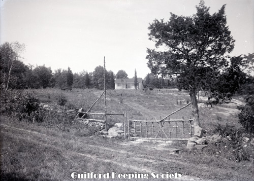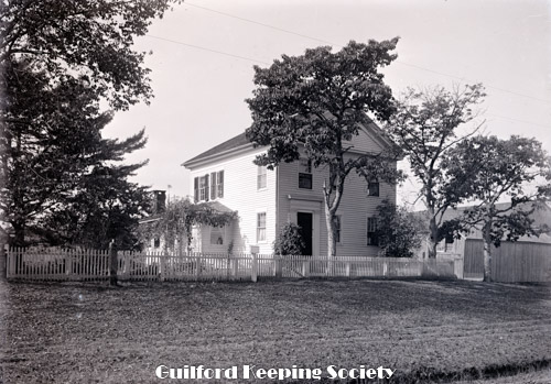 view of the front of a Greek Revival house with picket fence. A one story addition is on the left side. A barn shows on the right c1915