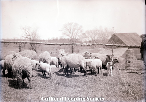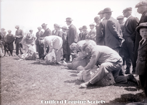 group of men shearing sheep William S. Leete's farm, across from barn on north side of Leete's Island Rd 616 Leete’s Island Rd c1915