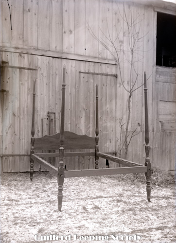 Eva B. Leete's antiques. A tall post bed with canopy missing, outside with a barn wall in the background. Side rails probably replaced. The posts are reeded c1915