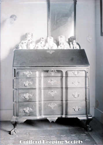 Eva B. Leete's antiques. Desk with lift front, 4 drawers, rope carving at base, bracket feet. One foot is missing. In one of Edward Leete's workshops 1090 Boston Post Rd or 148 North Fair St c1915