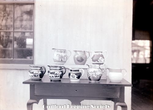 Eva B. Leete's antiques. 8 soft paste English pitchers, c1800 with luster detailing, on a table Edward Leete’s workshop at 1090 Boston Post Rd c1915