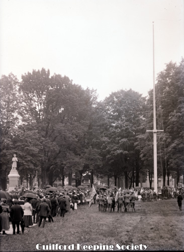 Memorial Day ceremonies on the Green around the Civil War statue. World War I liberty pole erected May 1918 is on the right. People are holding umbrellas Green 1918