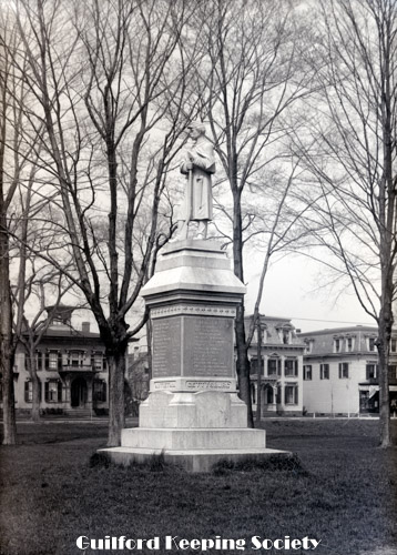 closeup of Civil War monument with houses in the background on Whitfield St Green c1915