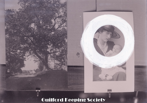photo copy of two photos. The one on the left is of the elm tree in front of the Thomas Griswold house 171 Boston St looking east. The other is a woman holding an infant 171 Boston St c1915