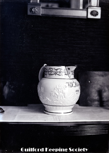 Eva B. Leete's antiques. A pitcher with the date 1828 and name J. T. Lath___ on the side c1915