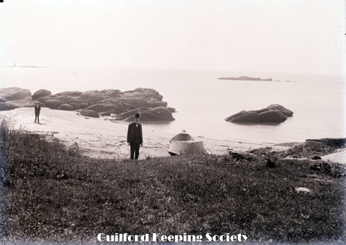 Two men in suits standing on sandy beach with a boat pulled up on shore. A few rocks show in the background. Probably on the Sachem's Head shoreline Sachem’s Head, probably a beach c1915