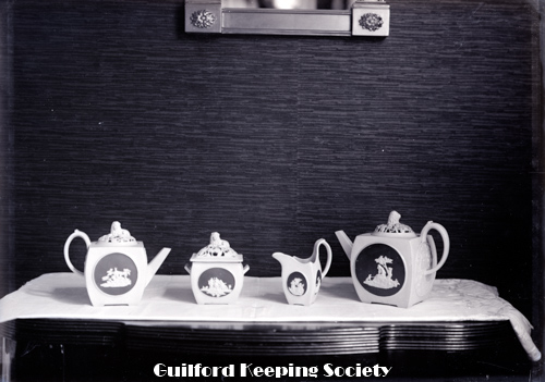 Eva B. Leete's antiques. Four piece tea set, possibly basalt with lion finials and Greek revival flavor, on a table c1915