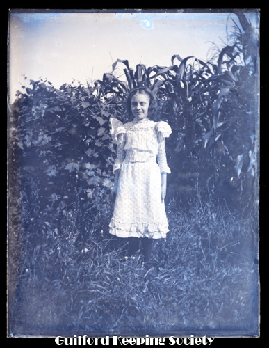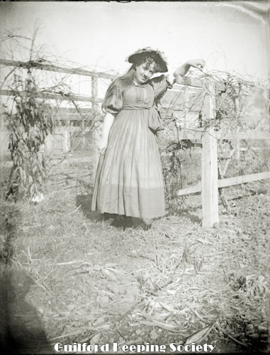 woman in long dress and hat standing and man seated in a chair, next to a picket fence, garden with corn in background c1910
