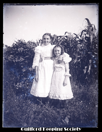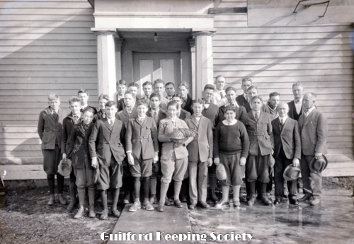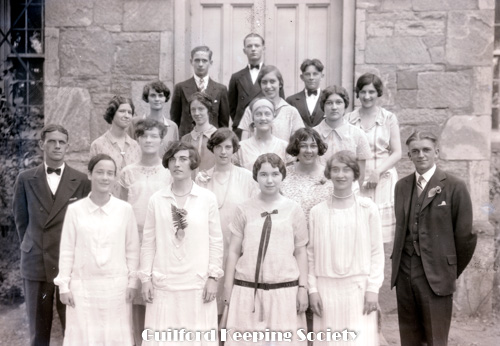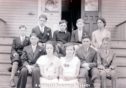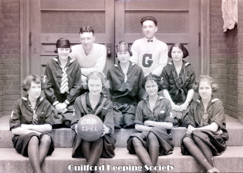 Guilford High School girl's basketball team 7 girls and 2 managers, seated on steps at Guilford Town Hall 31 Park St 1922