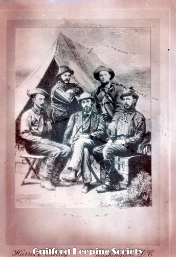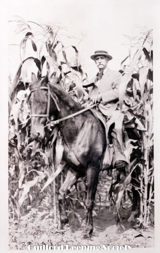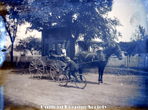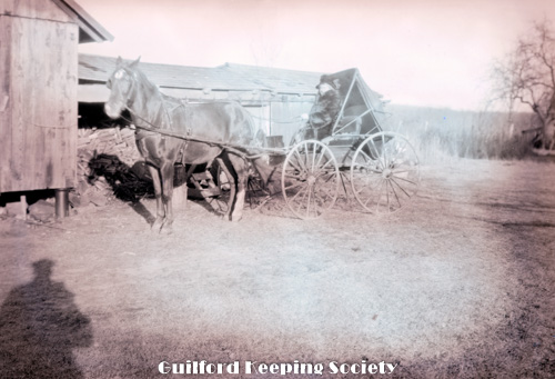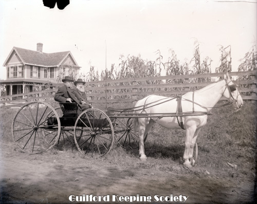 horse drawn carriage with two men, one with a beard, on a road. Queen Anne house on the left with a fenced cornfield adjacent, fence and cornstalks behind the carriage 352 Old Whitfield St, possibly