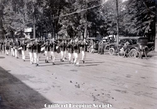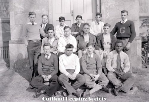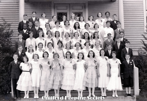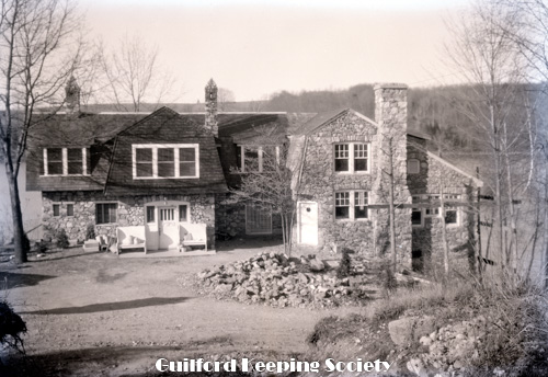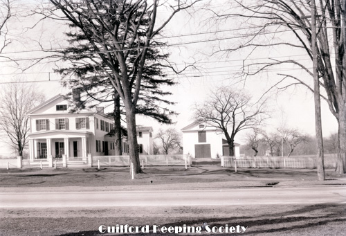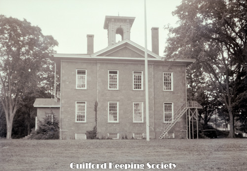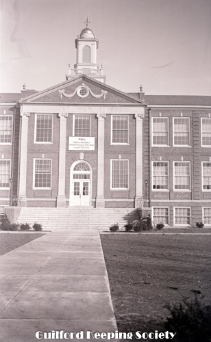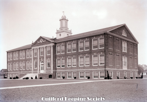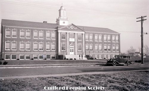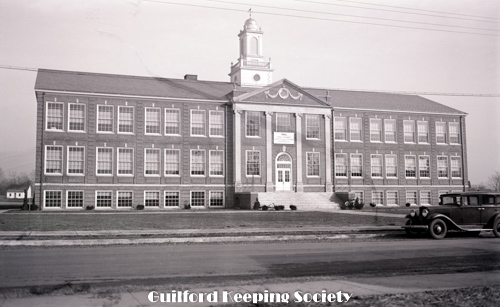 Guilford High School, front of the building with car on road in front 233 Church St 1937