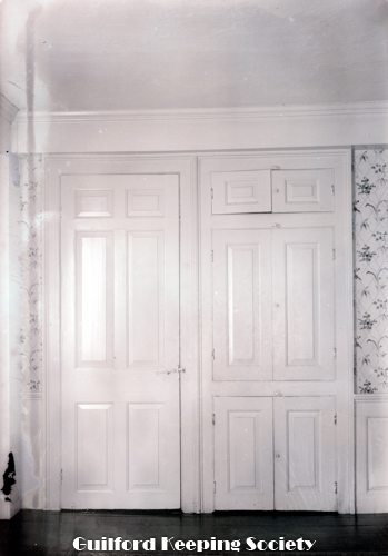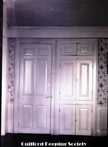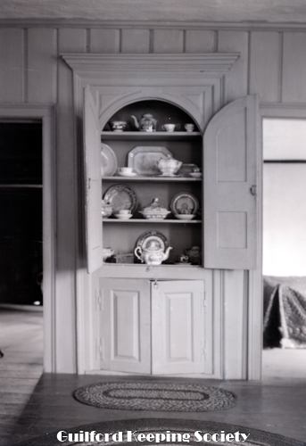 George Hyland house, interior, corner cupboard with wooden doors and china 84 Boston St c1930