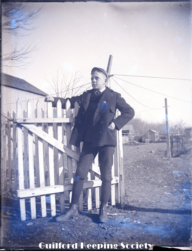 boy in knickers and cap standing next to a picket gate in a barnyard tight, elaborate clothesline and outbuildings visible in background c1910