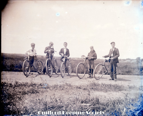 bicyclists, 5 young men in knickers, jackets and caps, standing in road with open field behind them c1910