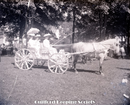 float for Fair Day parade, horesedrawn carriage with 3 women holding parasols. First Congregational Church in background Green, north end