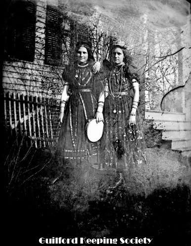 two women in costumes with beads, holding tambourine, one wearing a crown standing next to the side of a building c1910