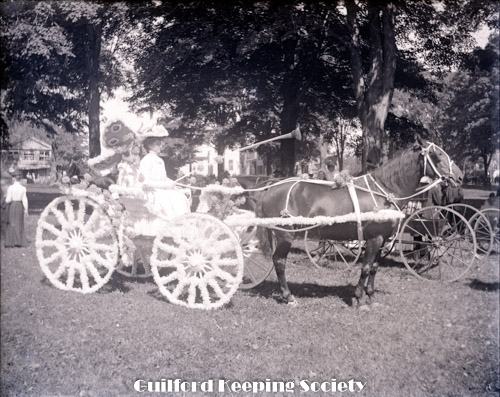 horse drawn float, decorated with flowers, First Congregational Church visible in the background Green, at the north end