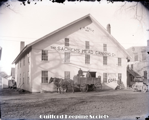 Sachem's Head Canning Co with horse drawn factory wagon in front. Sign at peak of roof, Fred H. Rolf Mgr Water St on the site of the town parking lot, just west of 11 Water St c1910