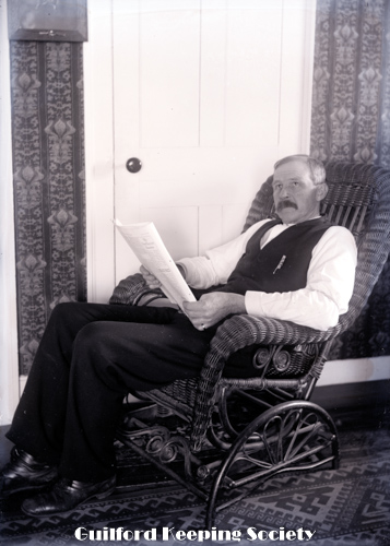man seated in a wicker rocker reading a magazine, probably the same man standing on far left in SWD1996