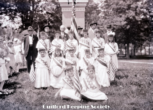 group of girls wearing sashes with stars, with flag and men who are probably veterans, in front of the Civil War monument at a patriotic celebration Green c1930