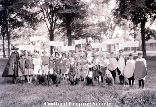 Public Health Nurse pageant, group of about 24 children in costumes, 5 appear to be animal costumes, 8 are holding signs with health slogans, also several adults Green 1924