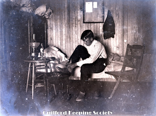 young man sitting on a bed tying his shoe, in a room with walls with vertical boards, possibly a camp cabin c1910