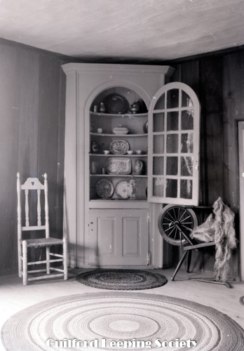 George Hyland house, interior, corner cupboard with glass door and small spinning wheel 84 Boston St c1930