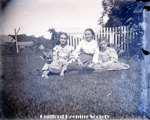 children, 2 girls and a boy, with mother seated on lawn. Outbuildings, clothesline and croquet wickets in background c1910