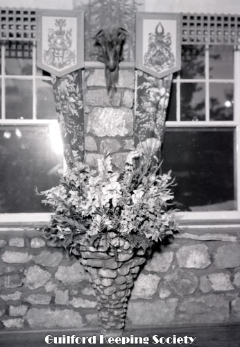 Robert Kintz house, closeup of stone vase on exterior wall of house with flower arrangement